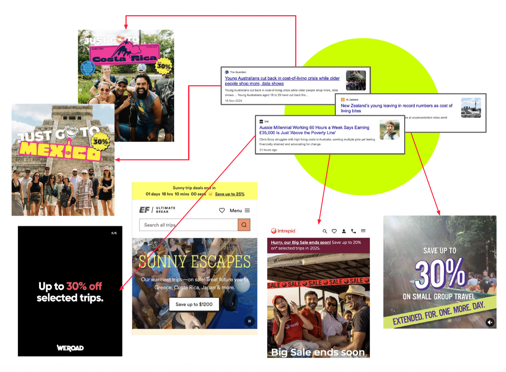 Young travellers believed travel was becoming unattainable, and the marketing solution being pushed our way was more discounting and sales. I wanted to challenge myself to find a creative solution that reframed this perceived poverty (cost-of-living rises) and made travel feel affordable again without discounting.