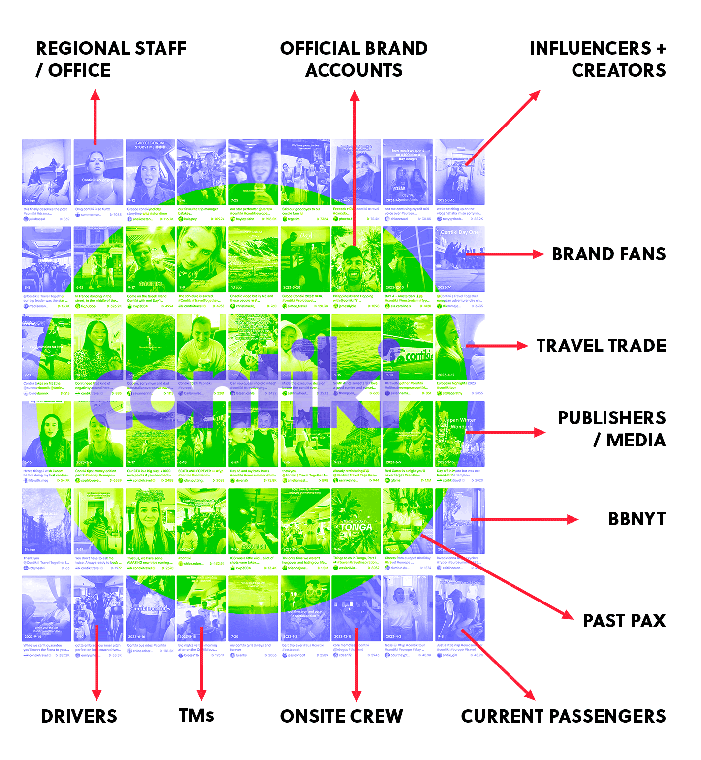 Social allowed anyone (paid influencers, travellers and competitors) to broadcast their impression of Coniki. Social search and Contiki mentions made it clear our messaging was being drowned out. We needed to take control the Contiki narrative by influencing those close to us to join the conversation. We upskilled and incentivised our crew, got passengers involved, and collabed with influential people in the social community.